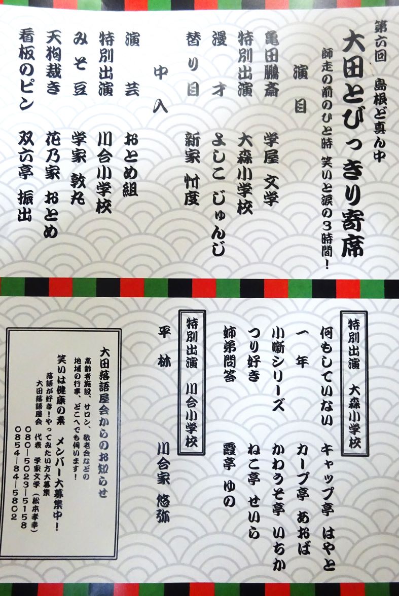 大田市民会館中ホールで落語、漫才、演芸の公演が開催されました。大森小学校と川合小学校の児童も参加して楽しい3時間を過ごしました。児童は小話ですが、どんな風に語っても拍手喝采です。大人は叶いません。一瞬に食い荒らしてしまいます。