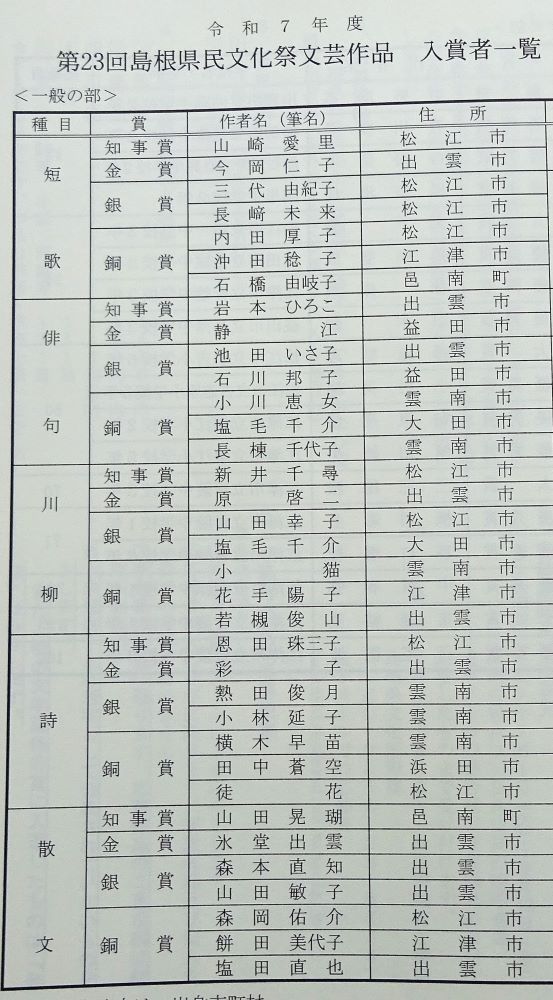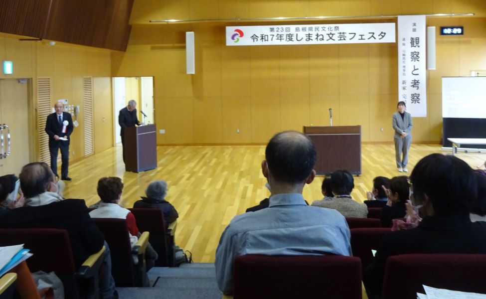 1月24日、江津市で、文芸作品入賞者表彰式と、しまね文芸フェスタの講演、各部門の交流会があり、無事終了しました。今年度は川柳部門が担当で、講師は新家完司氏。五感を生かして受け止め、考察して作句する大切さを具体的に作品を提示しながら話されました。