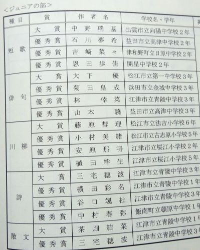 ジュニアの作品は2冊の本に掲載されています。学校の先生が授業で取り組まれて生まれた作品がほとんどですが、先生方の熱心なご指導に感謝します。短歌は357首、俳句53,川柳132,詩357,散文8篇の応募がありました。とても新鮮で素敵な作品です。