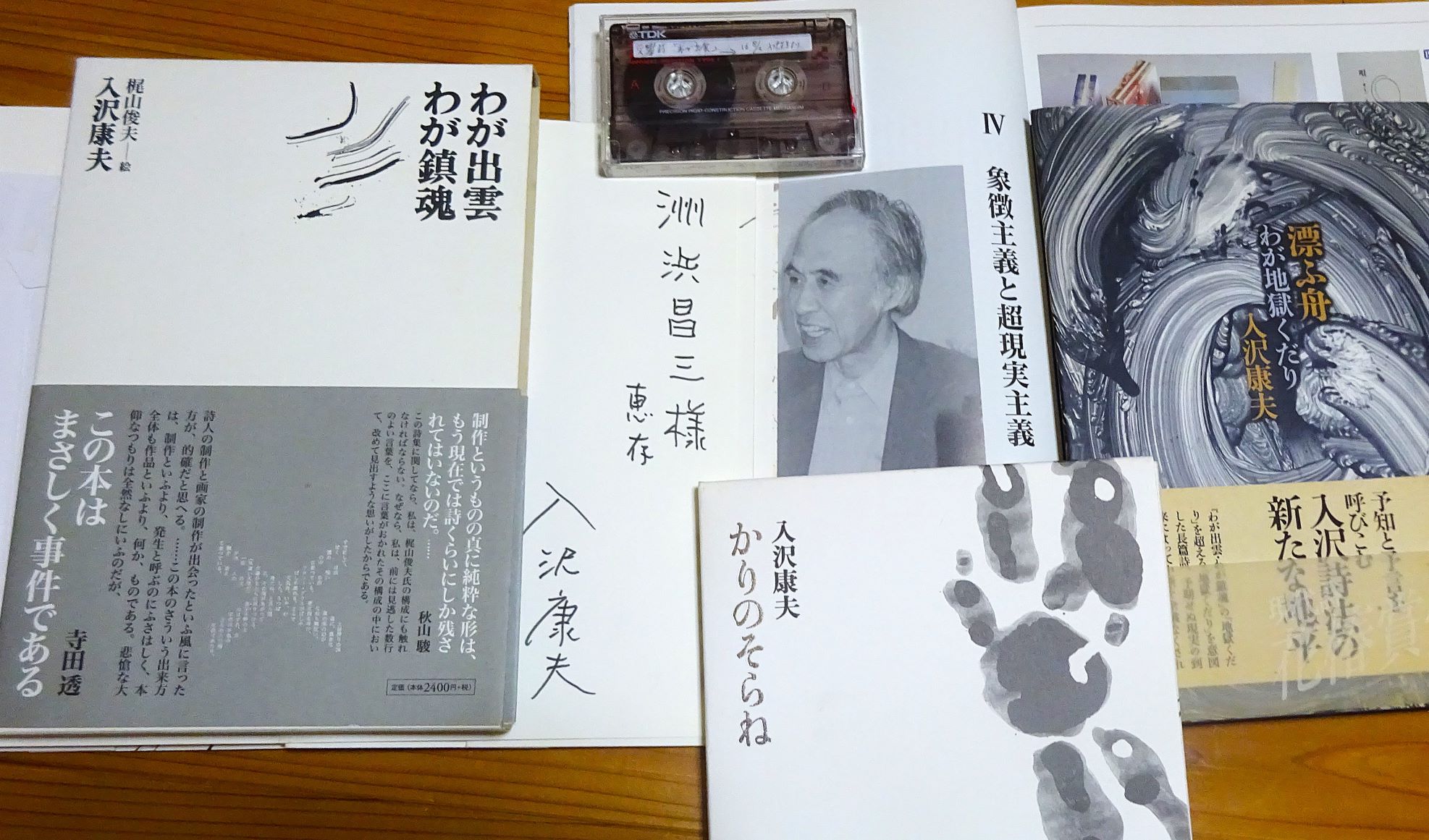 詩集『わが出雲 わが鎮魂』は『出雲国風土記』に基づいて書かれた名作です。いつか、この詩集の朗読をしたい、というのが夢でした。入沢先生の歓迎会で酒席を共にしたとき、「あの詩は難解だといわれています。確かに難解ですが、ぼくは朗読すれば面白いと思っています」と言ったら、なんと!!数日後に、サイン入りの詩集とテープが僕宛に届きました!